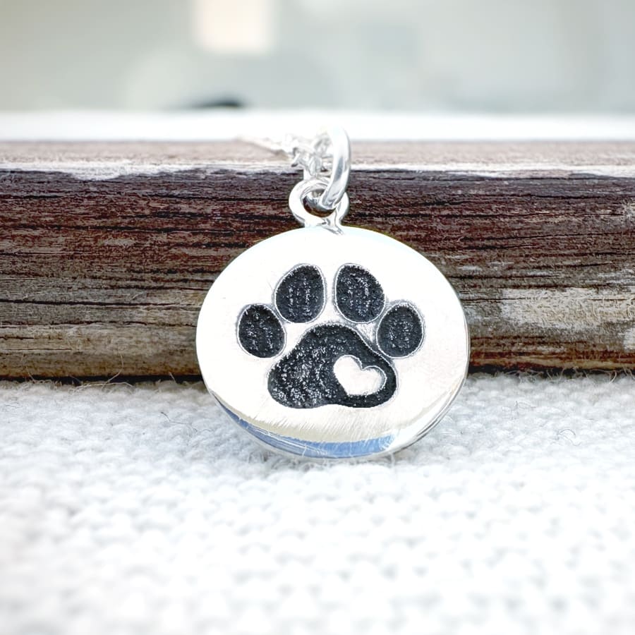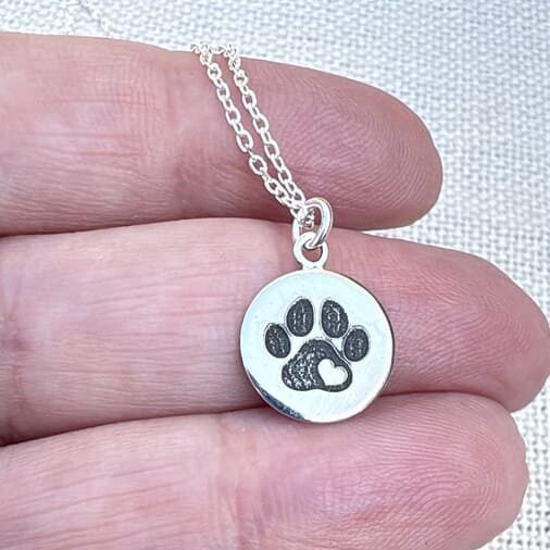 Aquest delicat collaret penjoll d’empremta de gos de plata de llei gravat amb una petita empremta i un cor, que porta la memòria i l’amor del teu amic fidel allà on vagis.